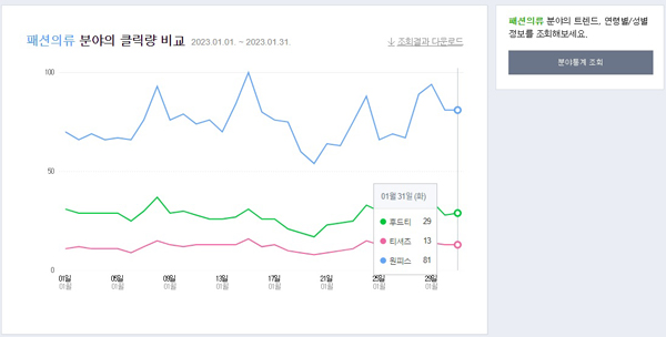 쇼핑 분야별 클릭 추이와 검색어 현황을 확인할 수 있습니다.