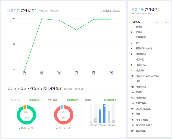 '여성의류' 인기 검색어가 TOP 500으로 나오니